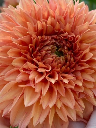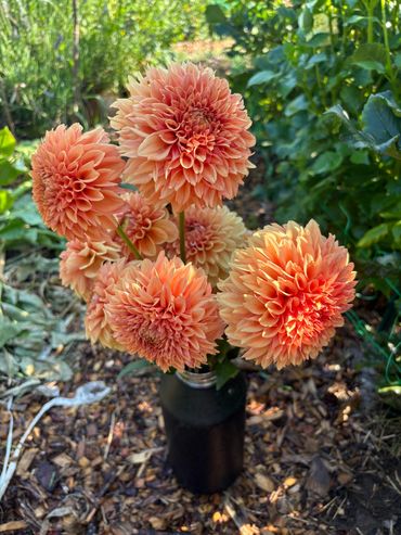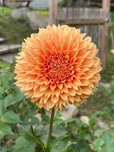 Long Road Teddy Bear is a 2022 seedling—a fluffy ball of rich orange petals that lives up to its cozy name. The plant grows to about 5 feet tall with dark green leaves. It's a heavy bloomer, though the flowers can droop a bit after a good rain.